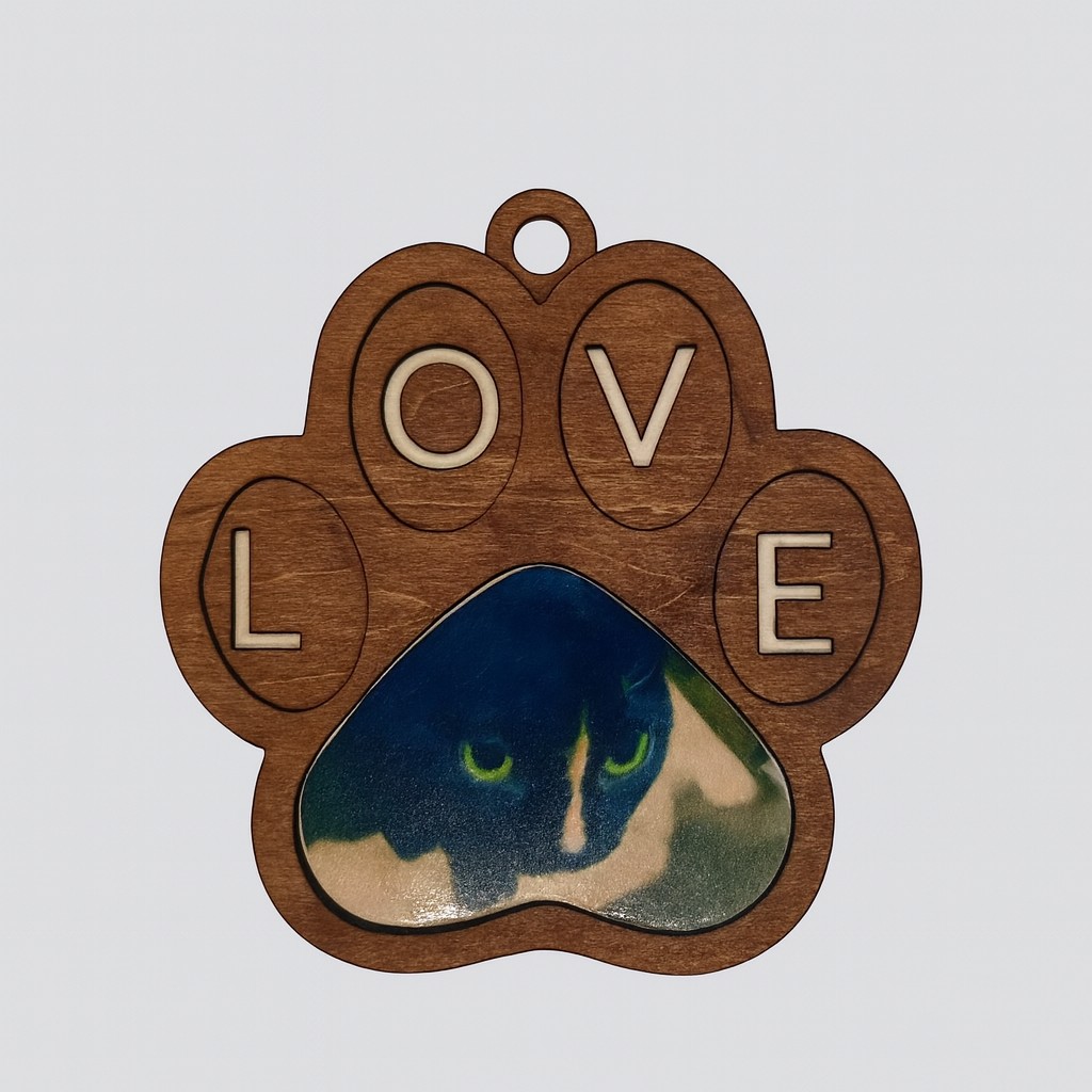 Celebra el amor por tu mascota con este adorable adorno en forma de huella, elaborado en madera natural y personalizado con la foto que tú elijas. Con la palabra «LOVE» grabada en relieve, este colgante es perfecto para decorar tu hogar, el árbol de Navidad o como recuerdo especial de tu compañero peludo.