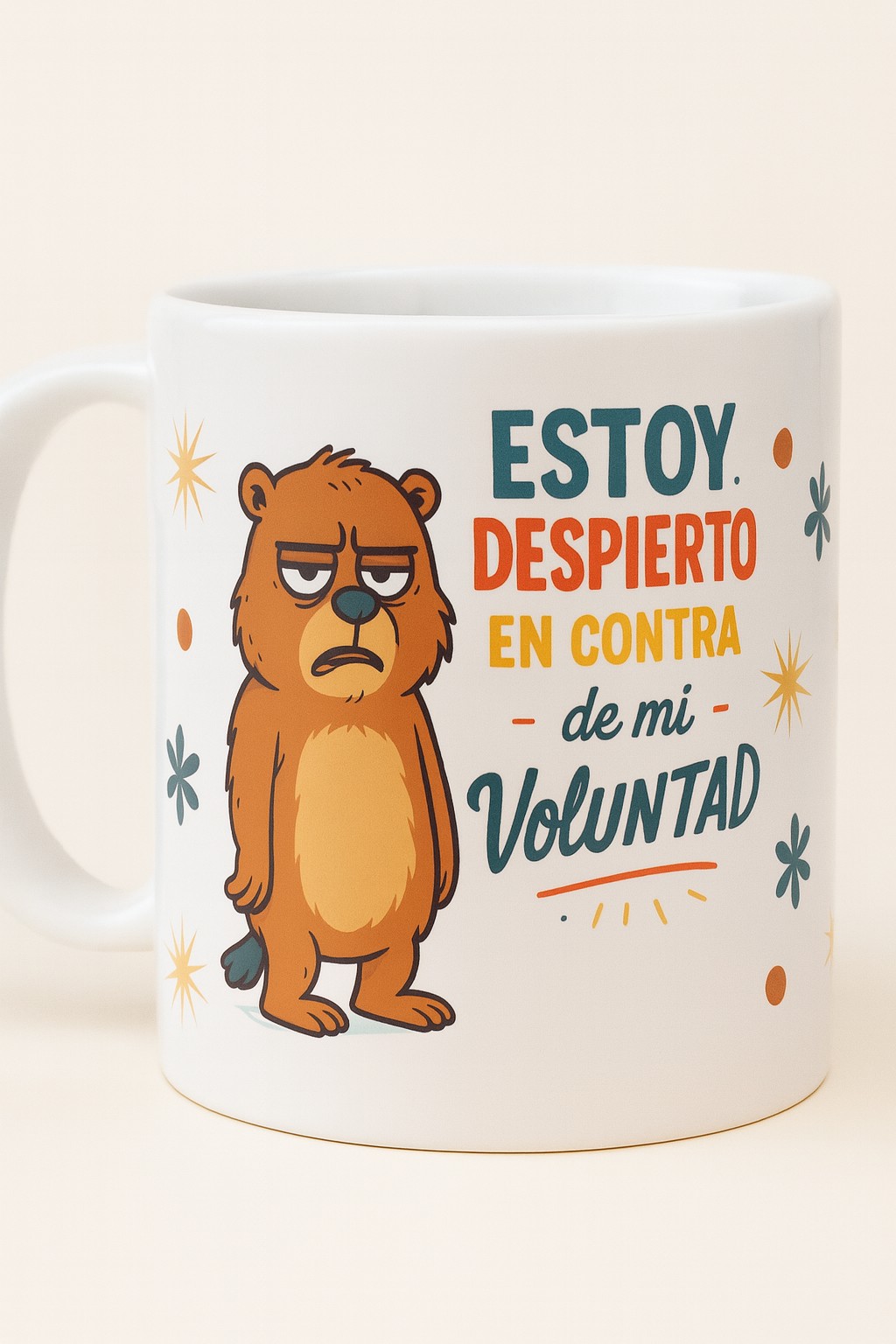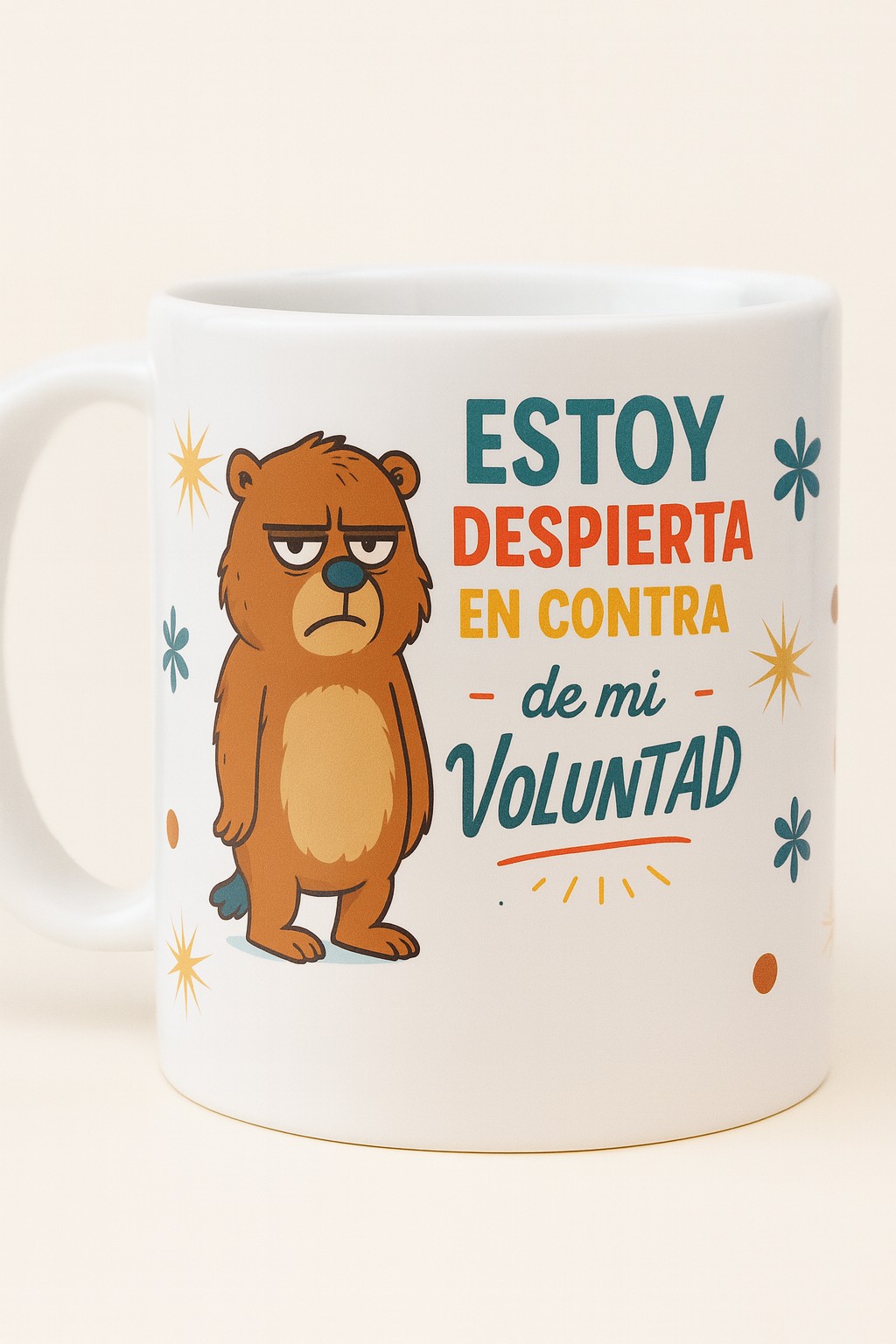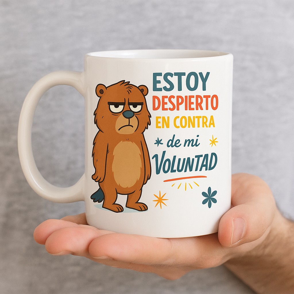 ¿No eres persona hasta que tomas café? Esta taza es para ti (o ese amigo que odia madrugar). Con un diseño divertido y un osito claramente molesto, esta taza expresa lo que muchos pensamos cada mañana: “Estoy despierto/a en contra de mi voluntad”. Perfecta para acompañarte en tus despertares más difíciles con café, té o chocolate caliente.